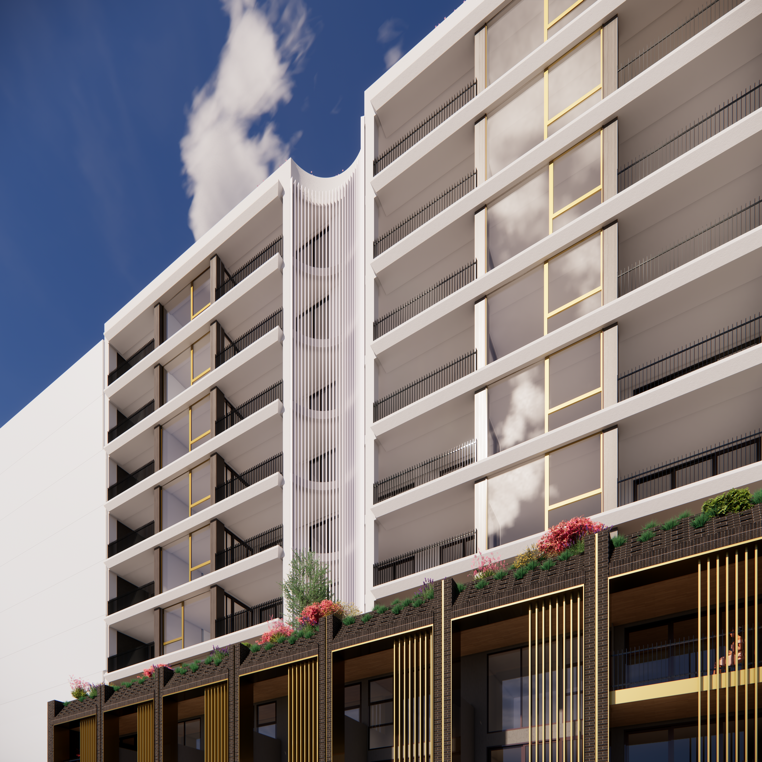 “A 76 unit development with an active street frontage and service lane, we designed Station Rd as a future-proofed design that allows the rear service lane to come a more active frontage. The development as a whole is designed to be a safe family oriented community with mulitple outdoor facilities on the roof and level 1. Two tower blocks over looking into a common open space wide enough for children to play and residents to congregate.”